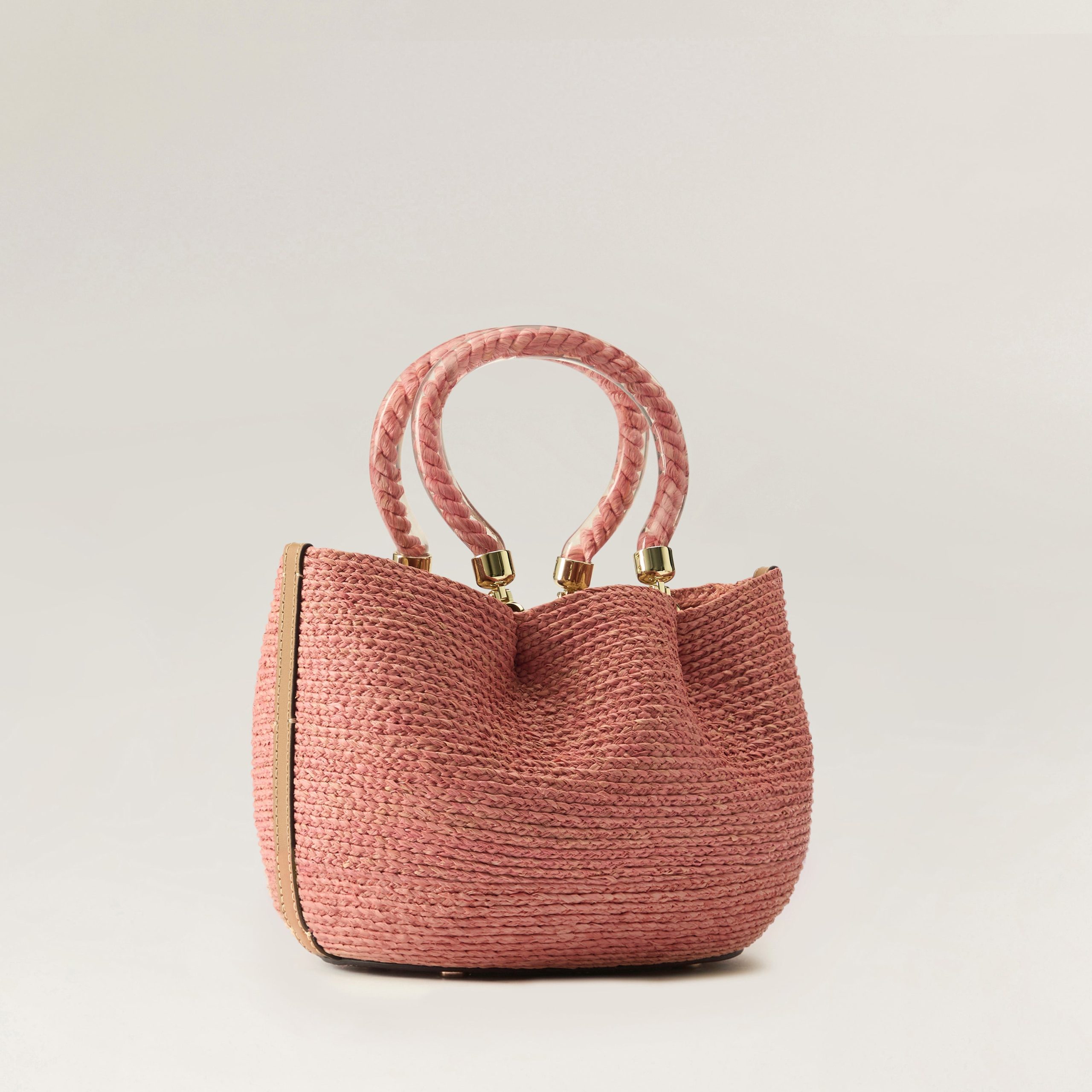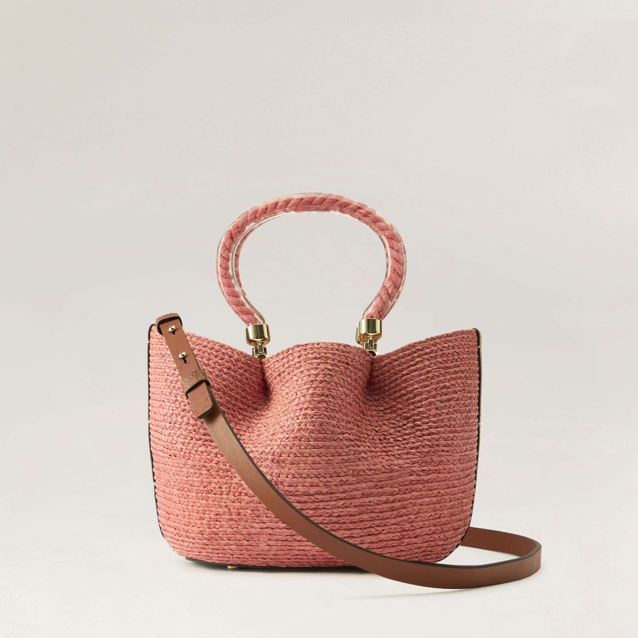 Inspired by the tranquil Mediterranean coastline, organic curves and playful accents take form. Handcrafted from 100% raffia and leather, the Camelia basket features a signature raffia rope and resin handle, contemporary signature hardware, and a removable leather shoulder strap for versatile styling. Available in four summer shades; natural, nougat, sunset, and pomelo.Small BasketArtisanally Crafted 100% Raffia BraidSignature Resin Handle Raffia Twisted Rope InsetLWG Certified Leather AccentsUnlinedHeight 19cmWidth 19.5cmDepth 17cmHandle Drop 15cmRemovable Shoulder Strap 45/+2.5cm extension