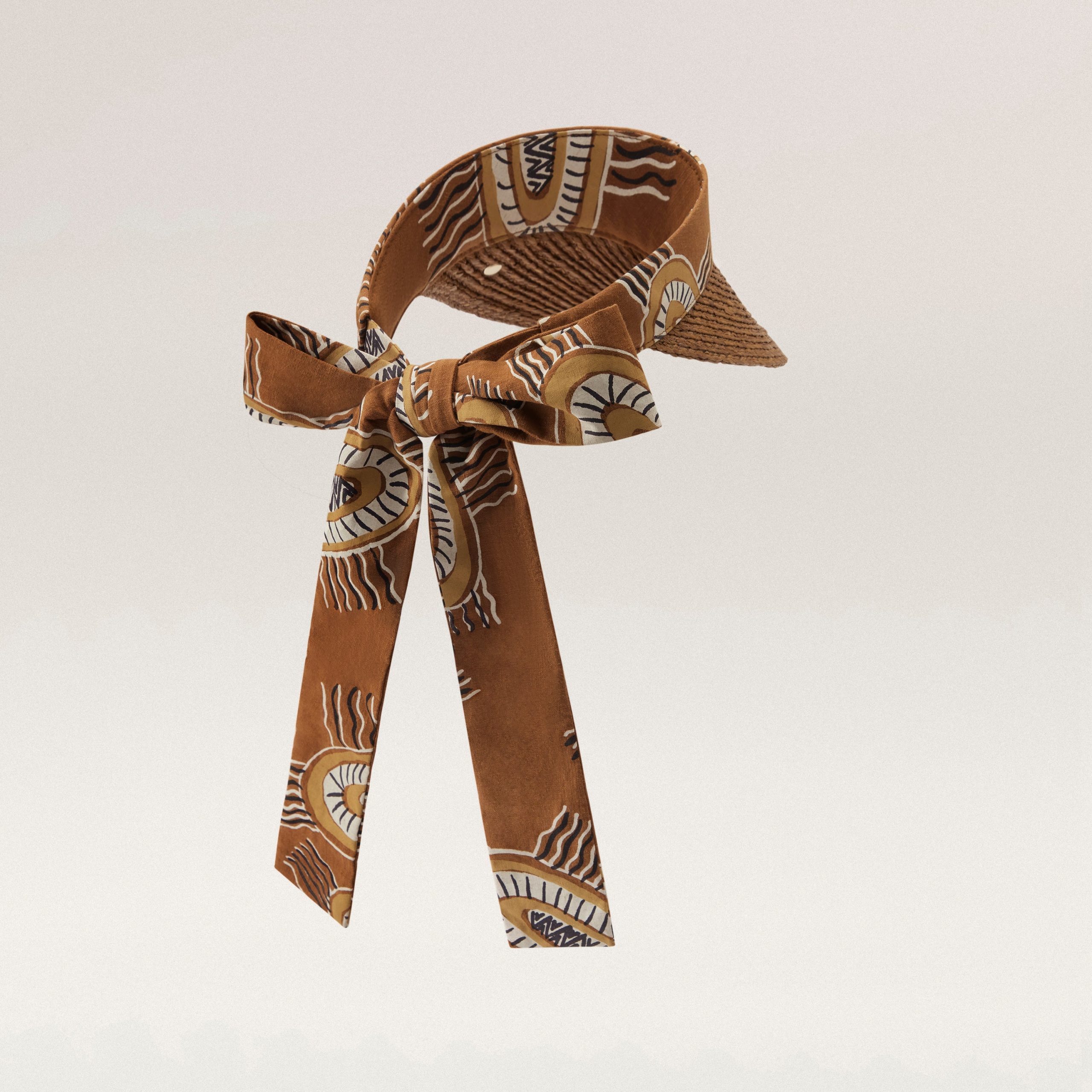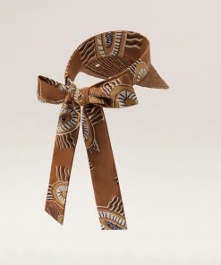 In partnership with Bábbarra Designs, artist Raylene Bonson has created a unique print depicting Marebu. The design comes from her mother’s side and is a special Kuninjku story. A Marebu is a handwoven mat made of Pandanus, a palm-like tree, and often coloured with natural dyes. It is an important multi use item serving practical and ceremonial purposes.Each length of fabric has been screen printed by hand in Melbourne, Australia. Bábbarra Designs is Bábbarra Women’s Centre’s internationally renowned textile studio based in Arnhem land, Australia. Marebu © Raylene Bonson Licensed by Copyright Agency Classic 3/4 Brim Visor Hand Crafted Raffia Braid Printed Linen Artworks by Belinda Kernan ‘Freshwater Billabong’ and Raylene Bonson ‘Marebu’ from Bábbarra Women’s Centre Arnhem Land, Australia 10.5cm Brim Size Adjustable Elastic Back Strap