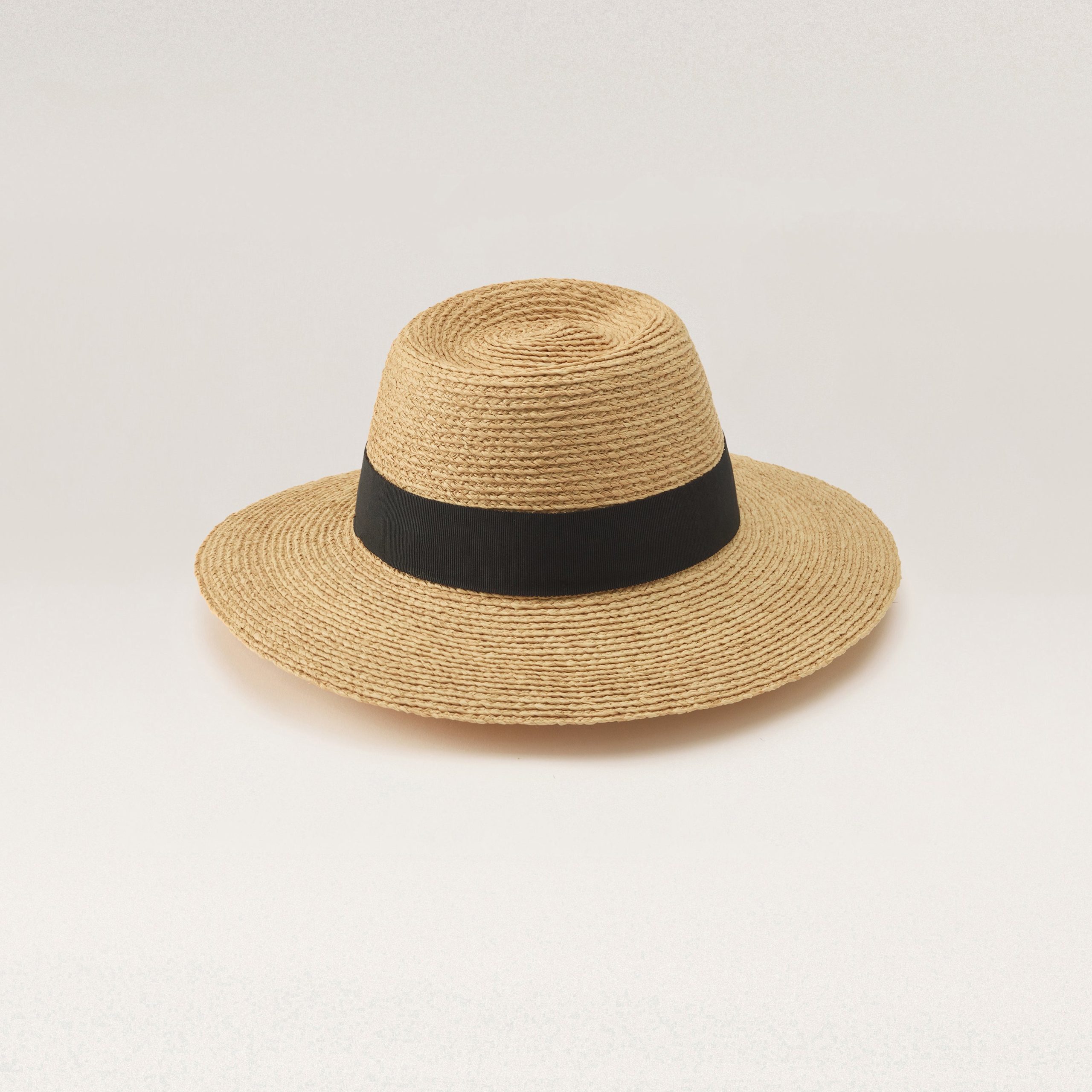 Jenna Wide Brim Fedora features a stylish flat brim and is hand-crafted from raffia braid, offering a sophisticated look. Accented with a chic bow detail, it includes a size-adjustable inner band for comfort and provides UPF 50+ protection for sunny days. Wide Brim Fedora Hand Crafted Raffia Braid 9cm Flat Brim Italian Grosgrain Ribbon with FSC Certified Viscose Trim with Bow Detail Size Adjustable Innerband for Fit and Comfort UPF 50+
