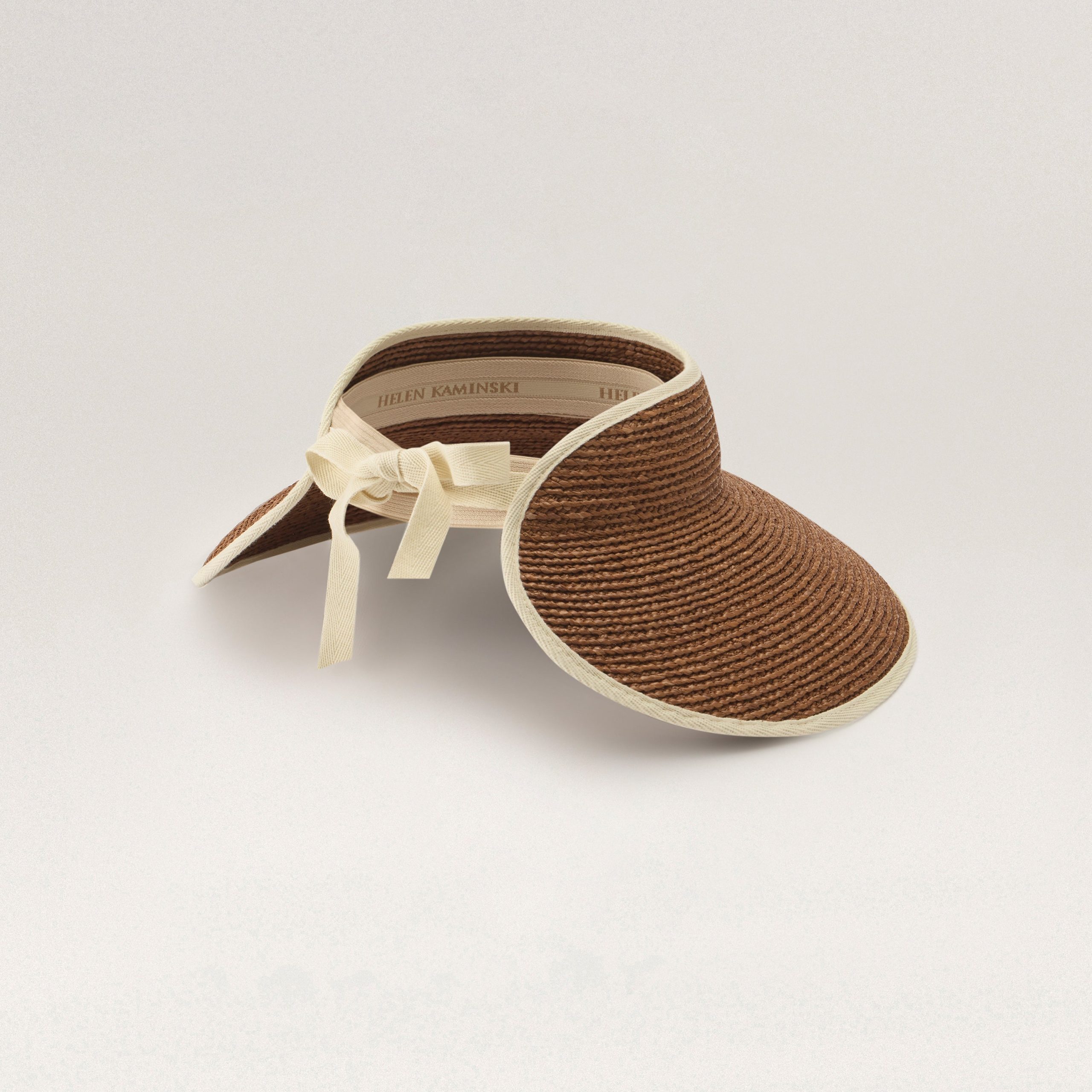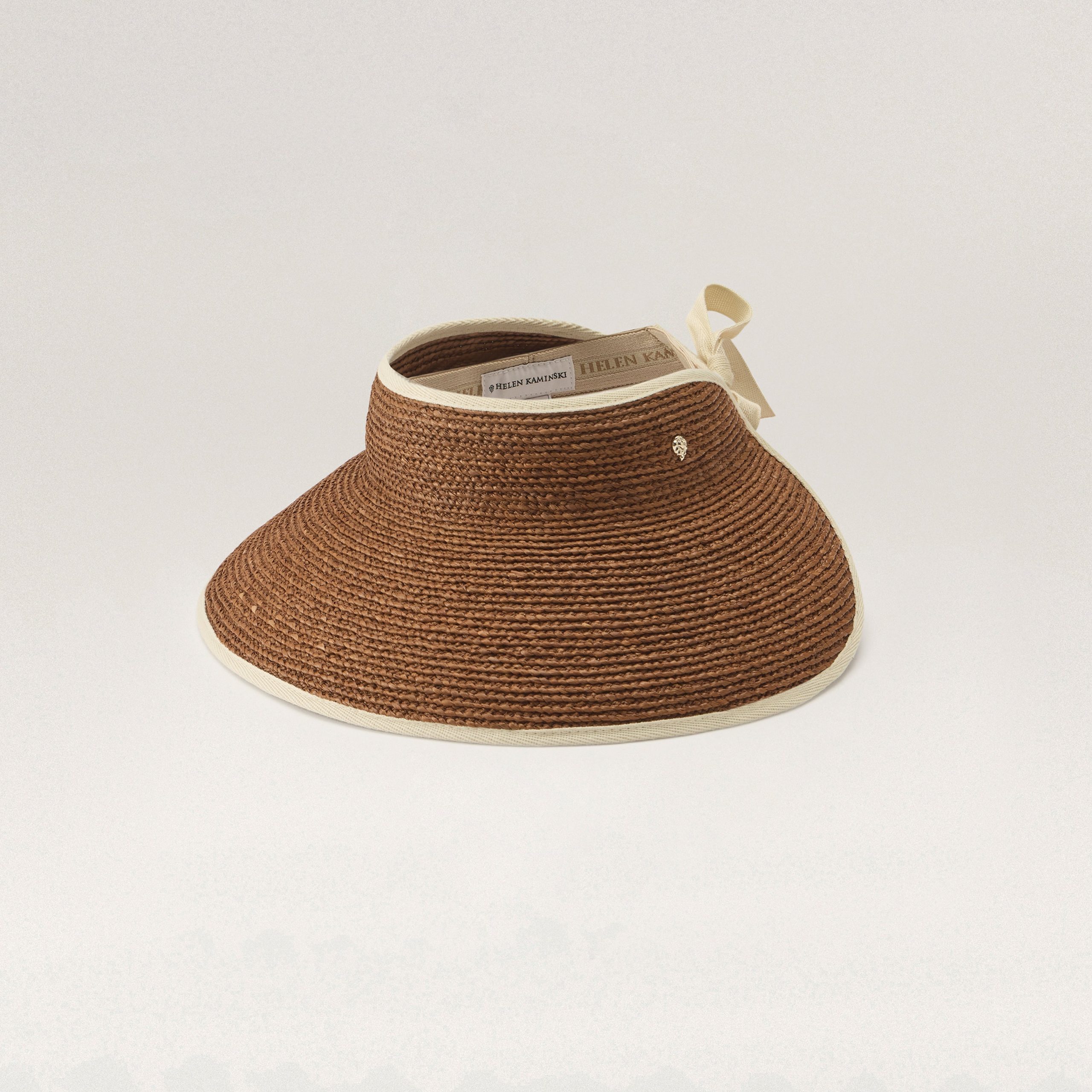 Mai quickly became an iconic Helen Kaminski visor shape with its oversized 12.5cm brim that wraps around your face for great style and sun protection. Feminine and elegant, the Mai is made from sustainably harvested Madagascan raffia that’s hand braided by artisans. A simple herringbone ribbon tie covers the elastic inner band, giving you the perfect fit with each wear. Classic 3/4 Brim Tie Adjustable Visor 12.5cm Peak Herringbone Ribbon Edge Bind and Tie Logo Elastic Inner Band