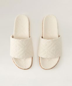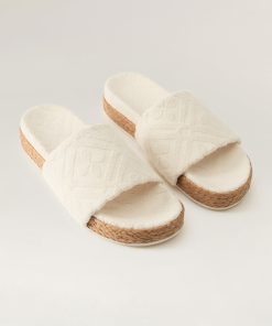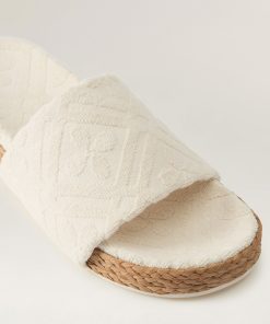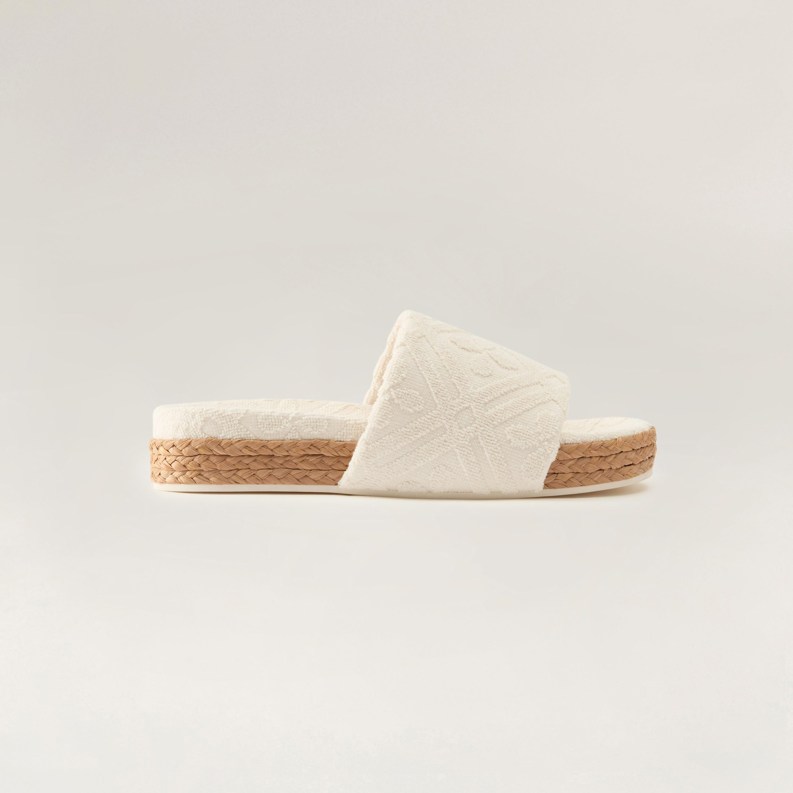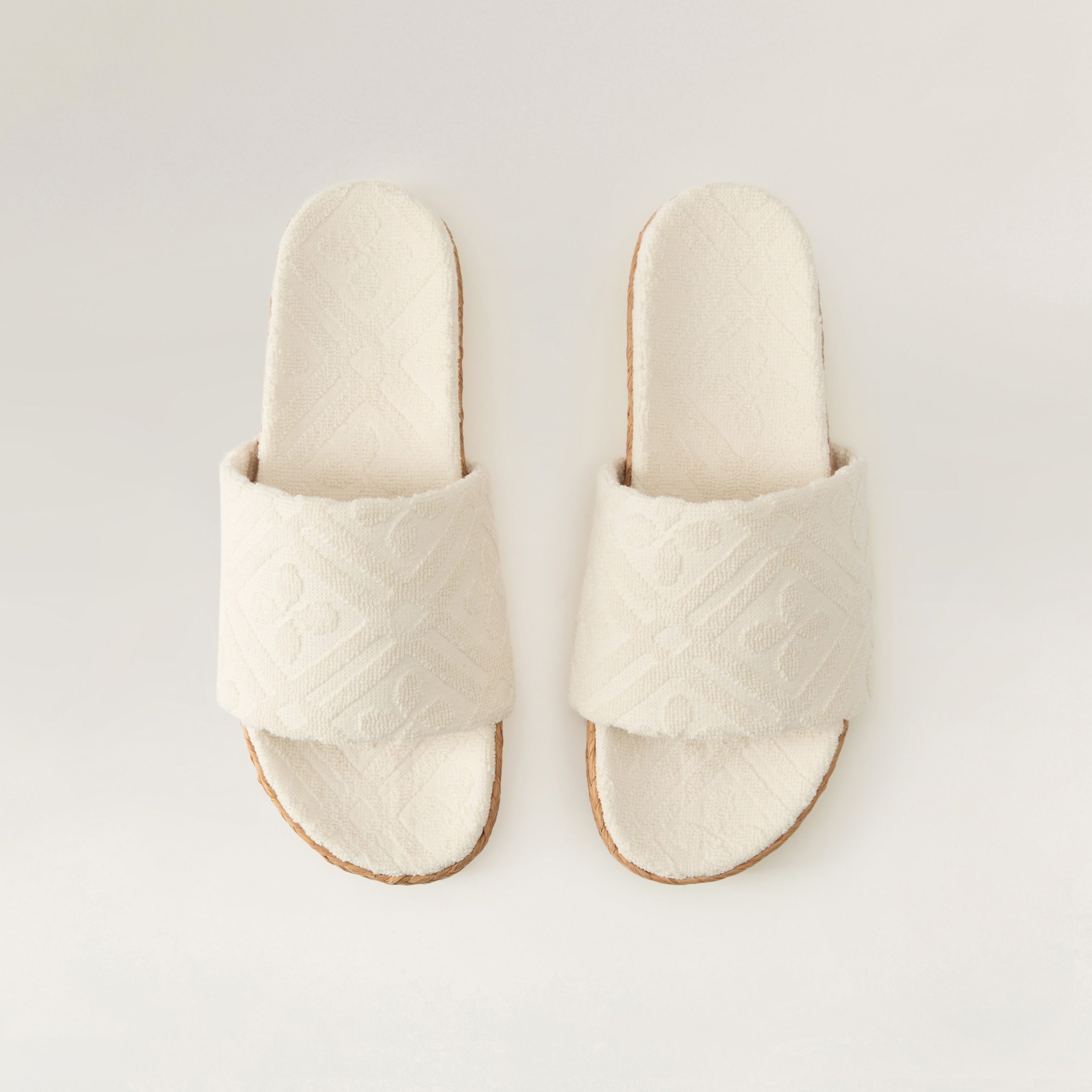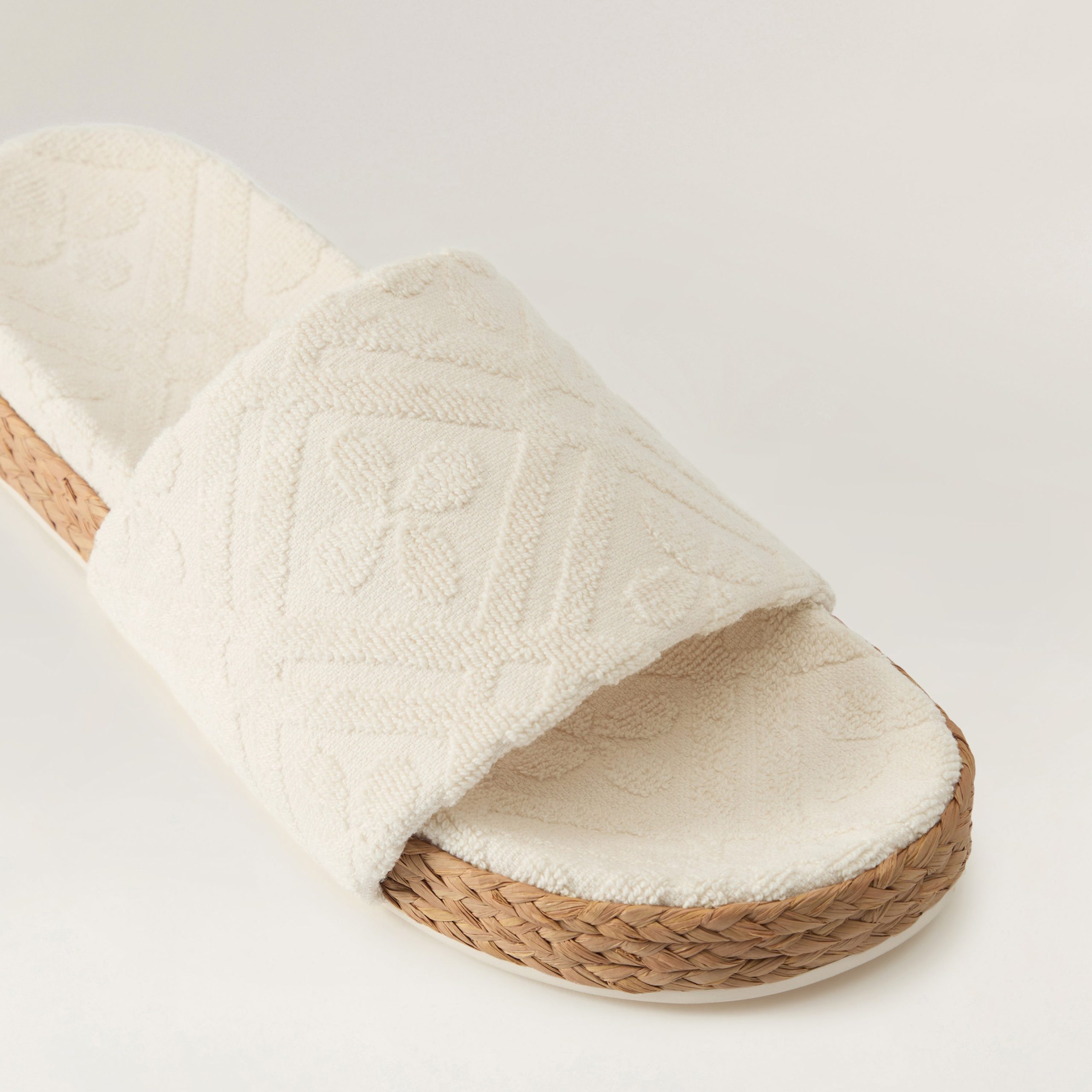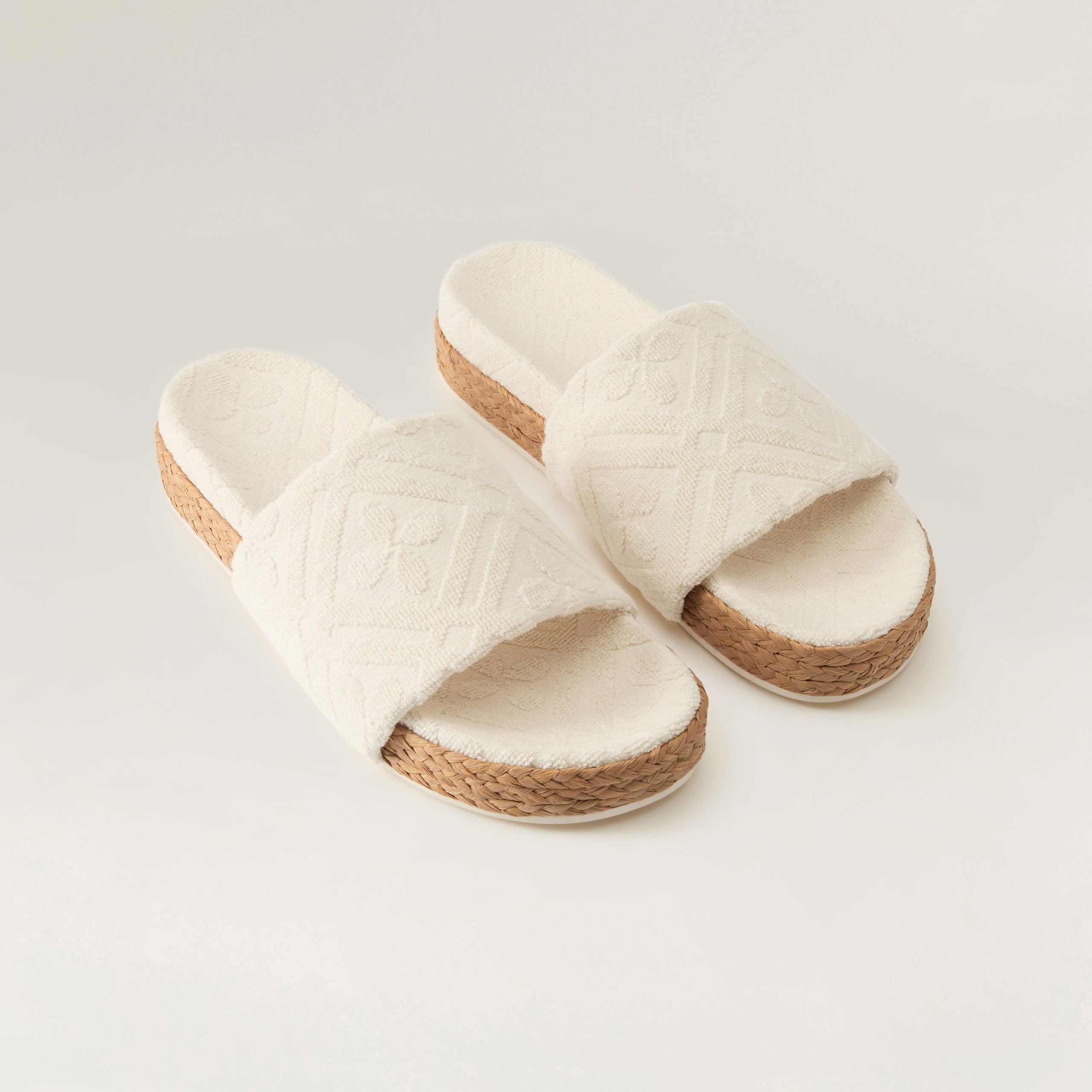 Slide into style with the Joanna Terry Slide, perfect for beach strolls, poolside lounging, or running weekend errands. Made from 100% Turkish cotton for supreme softness u0026amp; style. Embrace summer vibes with the Joanna Terry Slides. Available in medallion and parchment.Slide on SandalSpecially Crafted Terry Towelling Jacquard Design Featuring our Raffia SeedTerry Towelling Covered ABS FootbedBaby Braid Raffia covered OutsoleSignature Seed Logo Embossed on OutsoleRubber SolePlatform Height 35mm